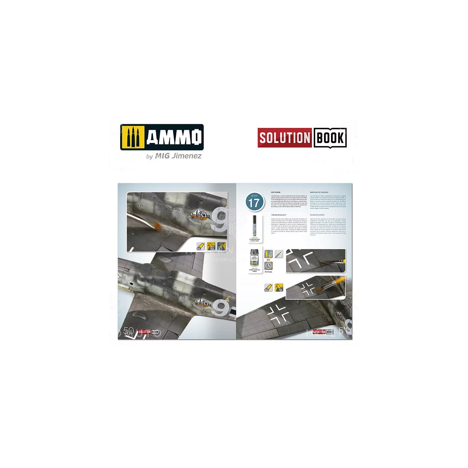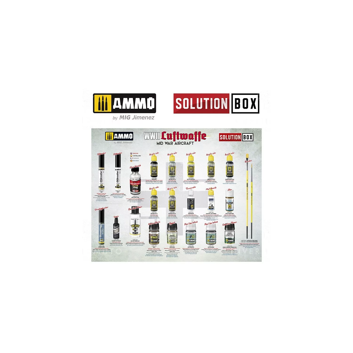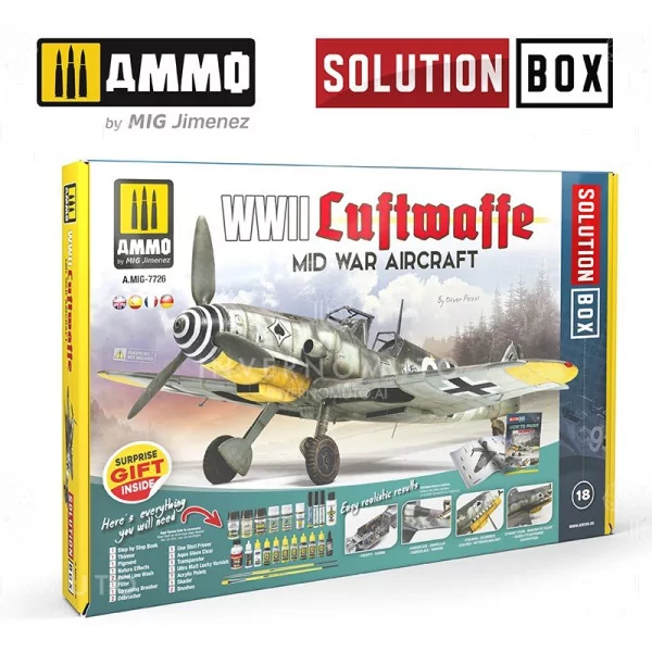 This Solution Box not only delivers the accurate colour paints, weathering products and brushes required, we have also included the valuable resource A.MIG-6526 How to Paint WWII LUFTWAFFE MID-WAR AIRCRAFT Solution Book as well, a complete 71-page guide with step-by-step tutorials in four languages including English, Spanish, French, and German, each explains how to apply the different colours and effects common to German aircraft operating during the intermediate stages of the WWII. SOLUTION BOOK is a simple and basic guide intended to help any modeller easily achieve similar results to those shown in each example. It doesn´t matter if the reader is a novice or a more seasoned and experienced modeller, by following the steps in this guide you will be able to obtain amazing results with the efficient and effective methods shown.